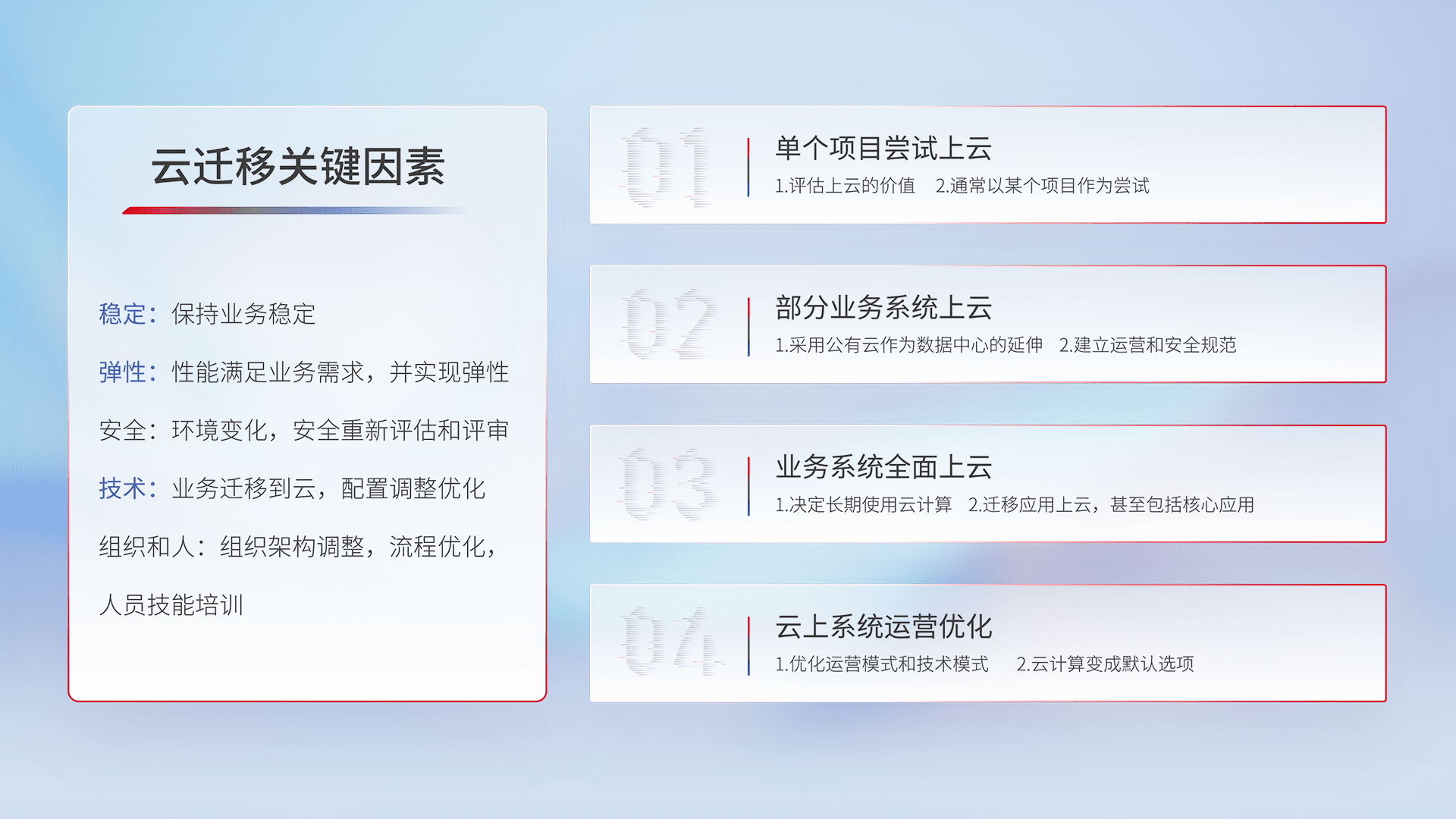 结合实际业务,,,从规划设计、、、、云平台选型、、、、云原生改造、、、数据迁移、、、集成交付,,,迁移全过程为客户识别最佳上云路径,,,,做好风险识别管理,,,设计网络架构、、、身份权限、、、、安全审计合规、、操作审计、、、日志审计、、、监控告警策略、、多站点容灾设计等,,对云上基础设施进行整体规划,,提升IT治理水平,,,,以满足弹性、、、高可用、、高性能的需求。。。