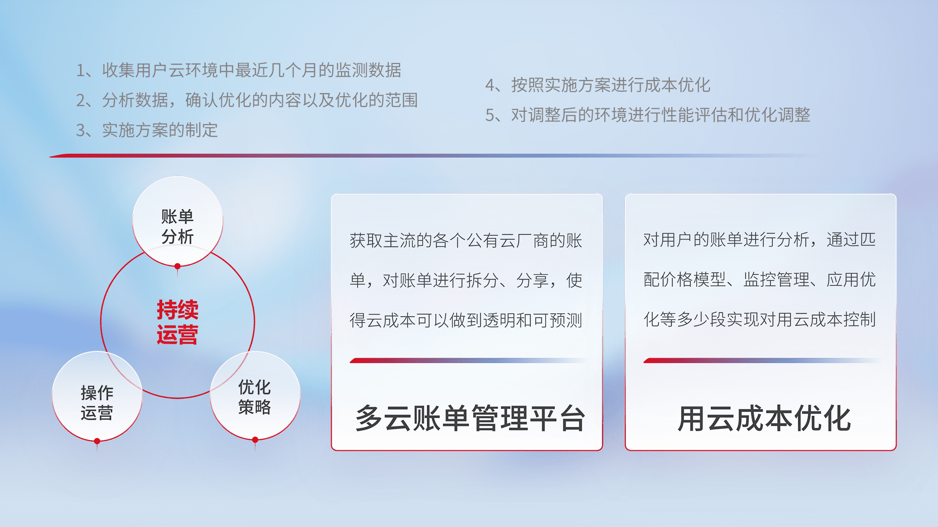 通过多云纳管,,,,以统一的资源数据模型把客户的云资源进行抽象和封装,,,,进而实现对多云资源的统一操作,,,,保障云资源管理的可靠性、、、、稳定性与可用性。。。。量身定制化运维内容,,,配置、、开发运维、、、、补丁管理、、、、备份、、、监控、、、认证和访问管理、、、审计和日常巡检等,,,保障在用云过程中的可靠度,,,,稳定度以及高可用率。。。