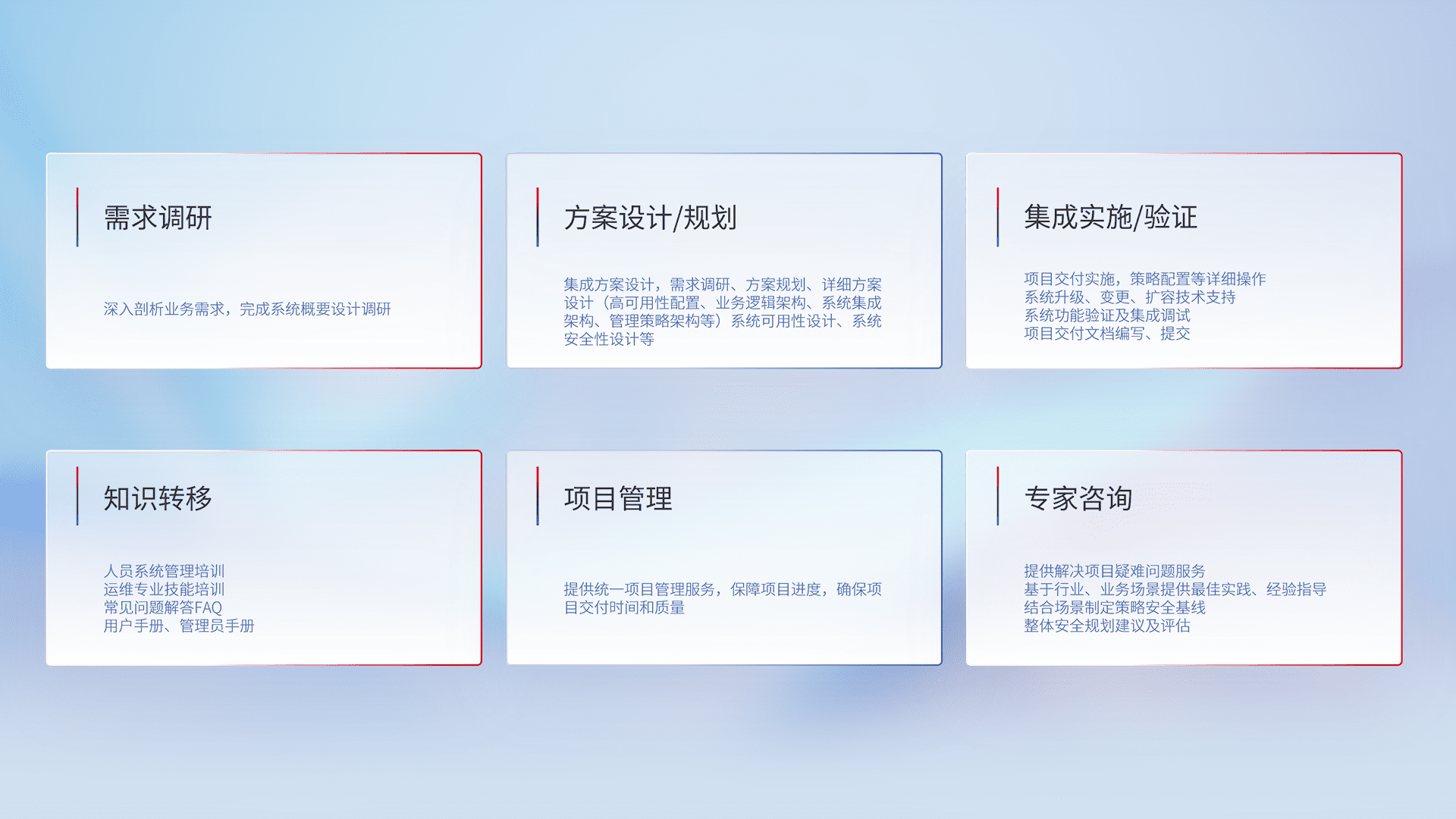 针对客户行业特性,,,将宏观的安全战略和需求,,,通过专业的交付服务,,实现项目落地,,为客户提供标准规范的集成交付服务。。。。